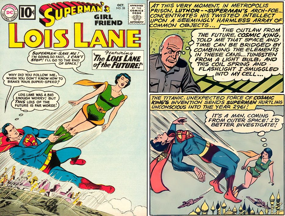 LOIS LANE 28 (Sept) Superman is hurtled to the Legion's time by a weapon Luthor builds following Cosmic King's instructions. No Legion appearance. Did you know you can make a time machine from citric acid and tungsten?